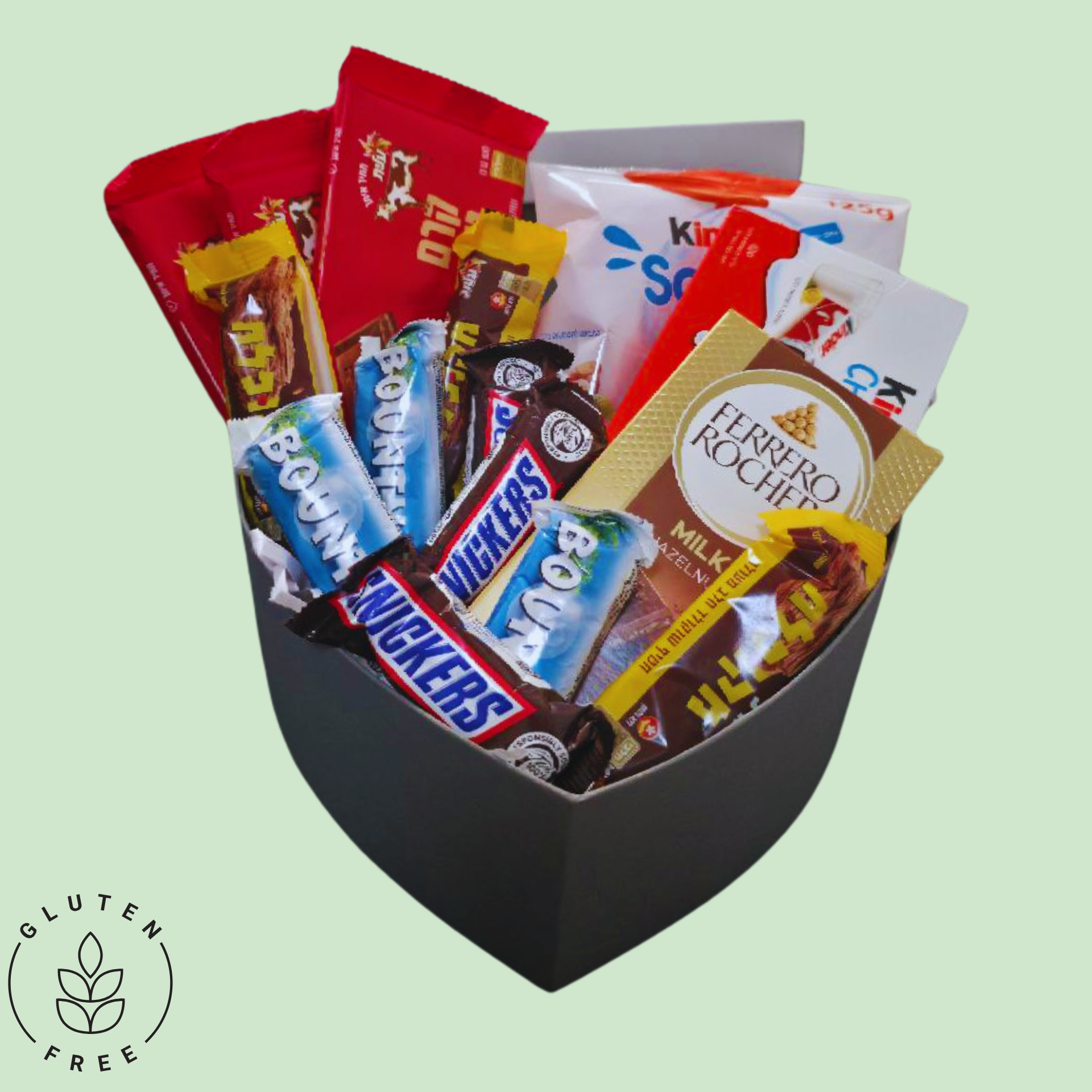 המארז מגיע בקופסה מהודרת בצורת לב, ומכיל אך ורק מוצרים שאינם מכילים גלוטן ברכיביהם. הוא ארוז בצלופן וסרט אלגנטי, ומוכן להעניק חיוך כובש לאדם שאתם אוהבים – גם אם הוא רגיש לגלוטן.