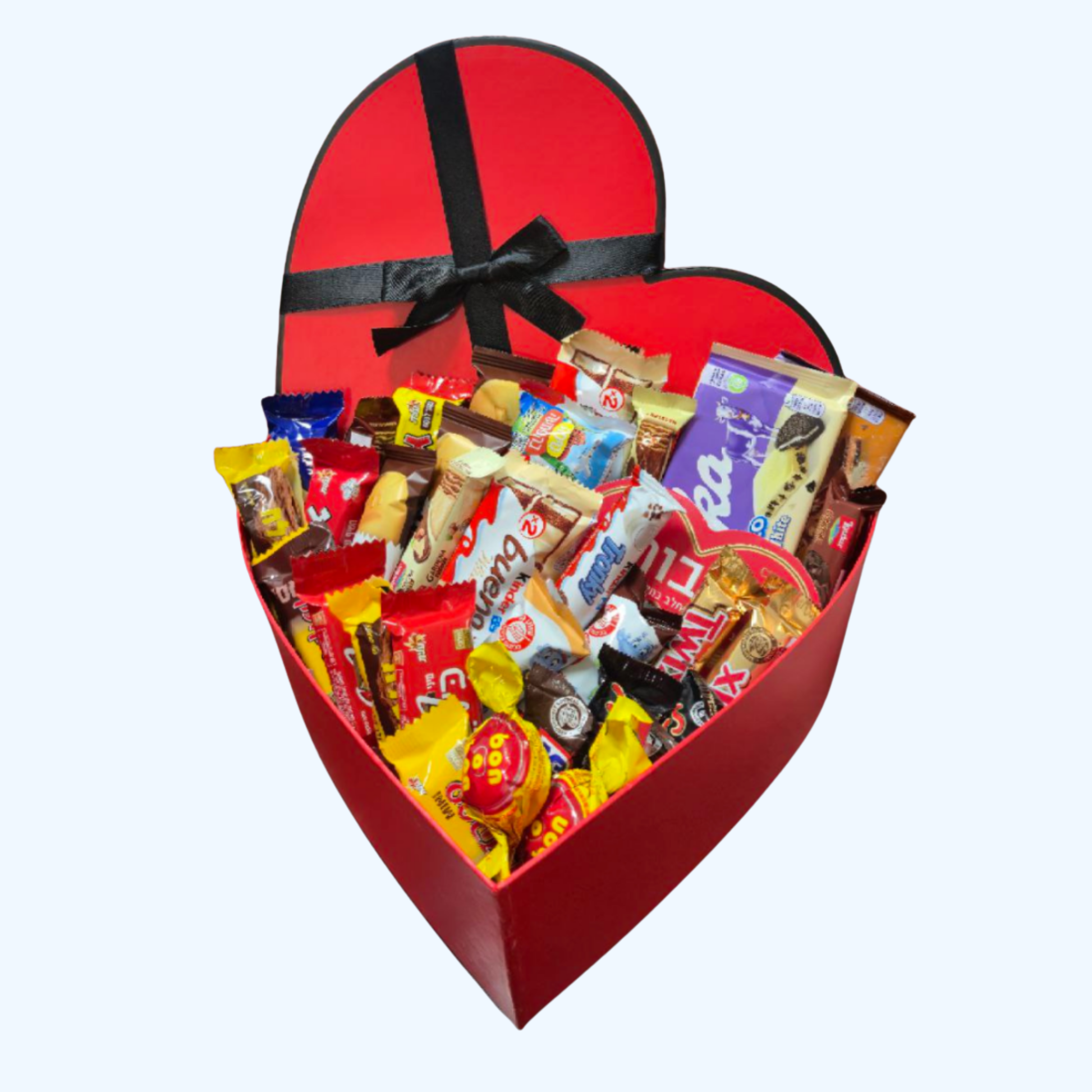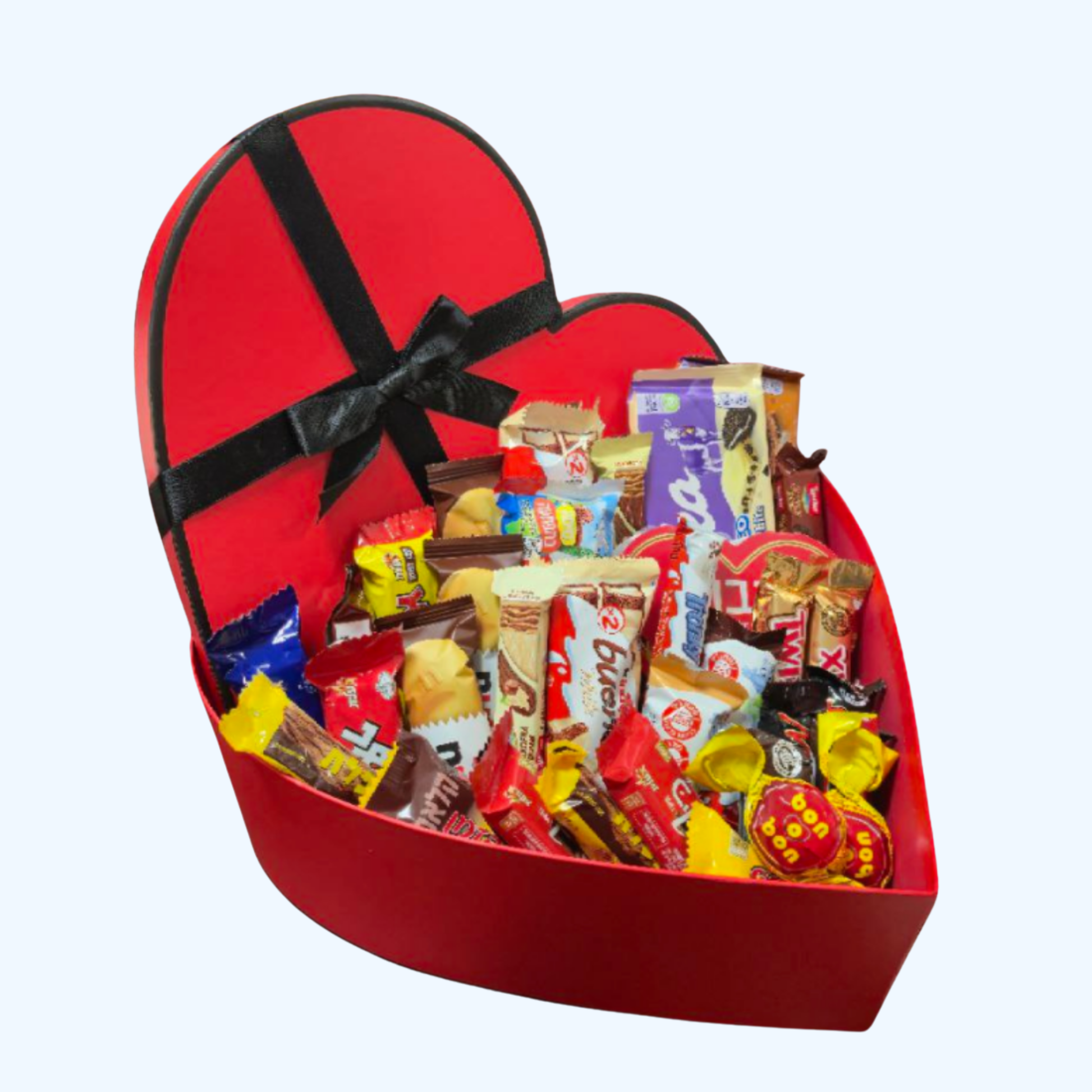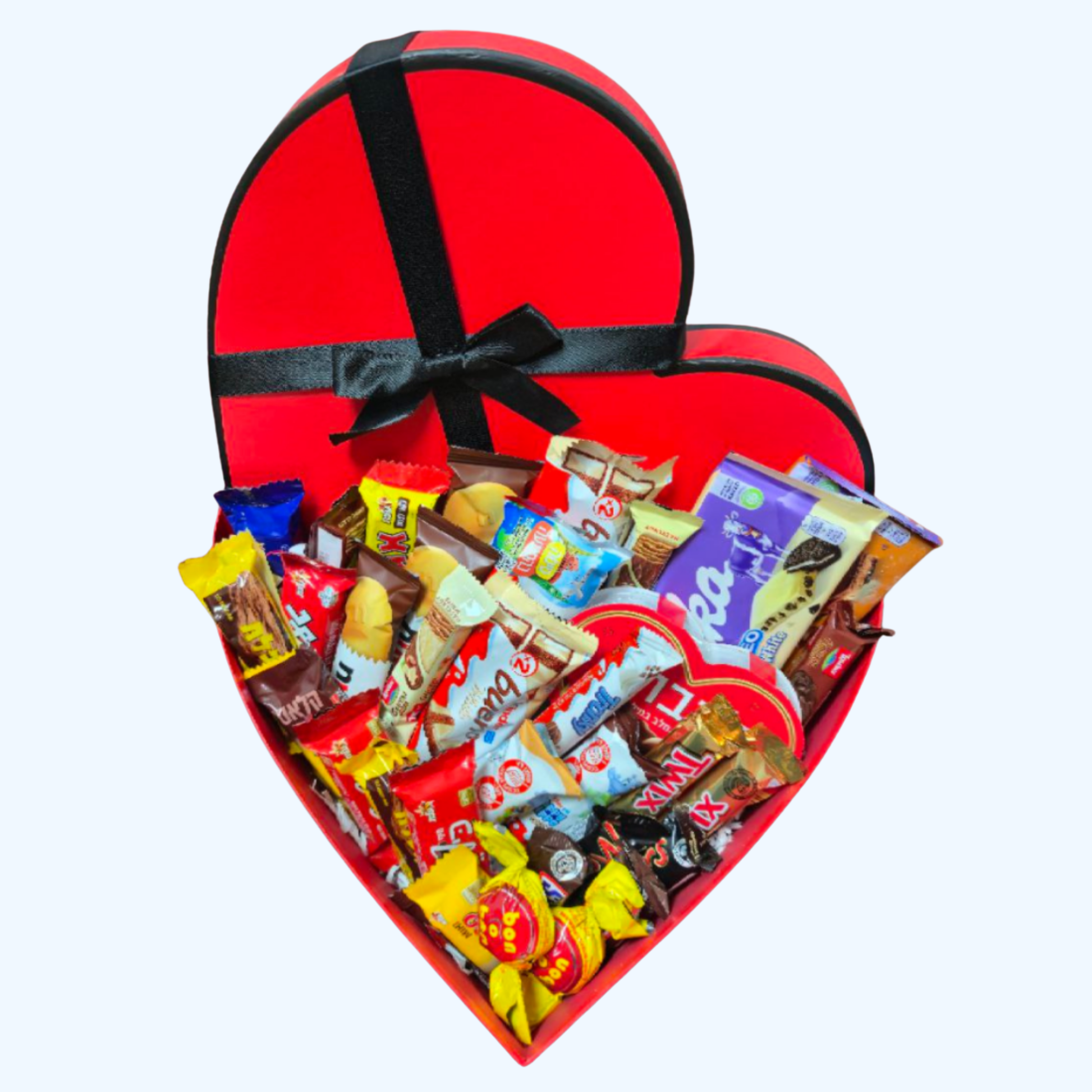 המארז מעוצב בצורת לב מרשים בקוטר 33 ס״מ ומלא עד אפס מקום בשוקולדים מובחרים, חטיפים אהובים וטוויסט רומנטי. מושלם ליום אהבה, ימי נישואין, הצעות נישואין, יום הולדת זוגי או פשוט כשאתם רוצים להגיד: ״אני אוהב/ת אותך״.