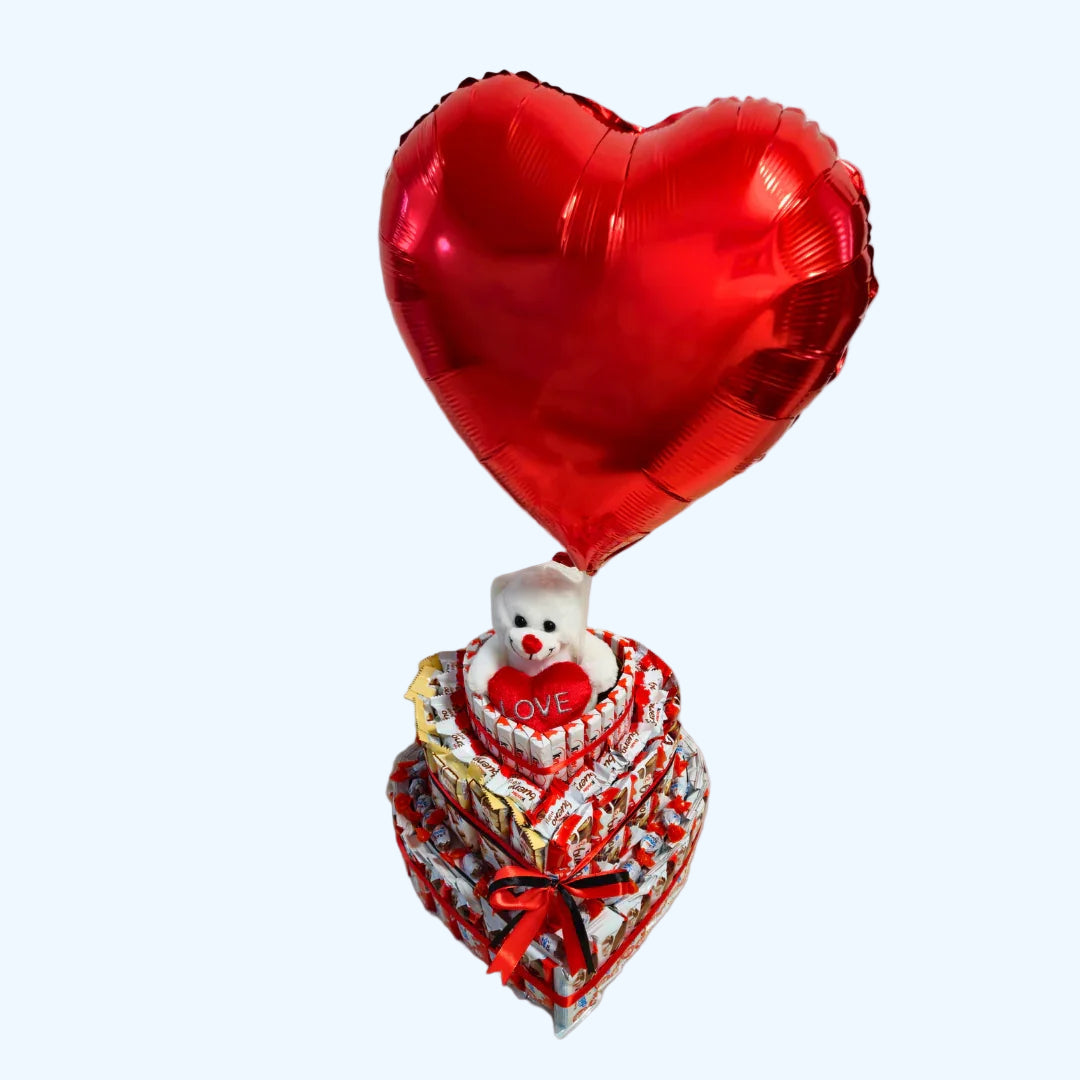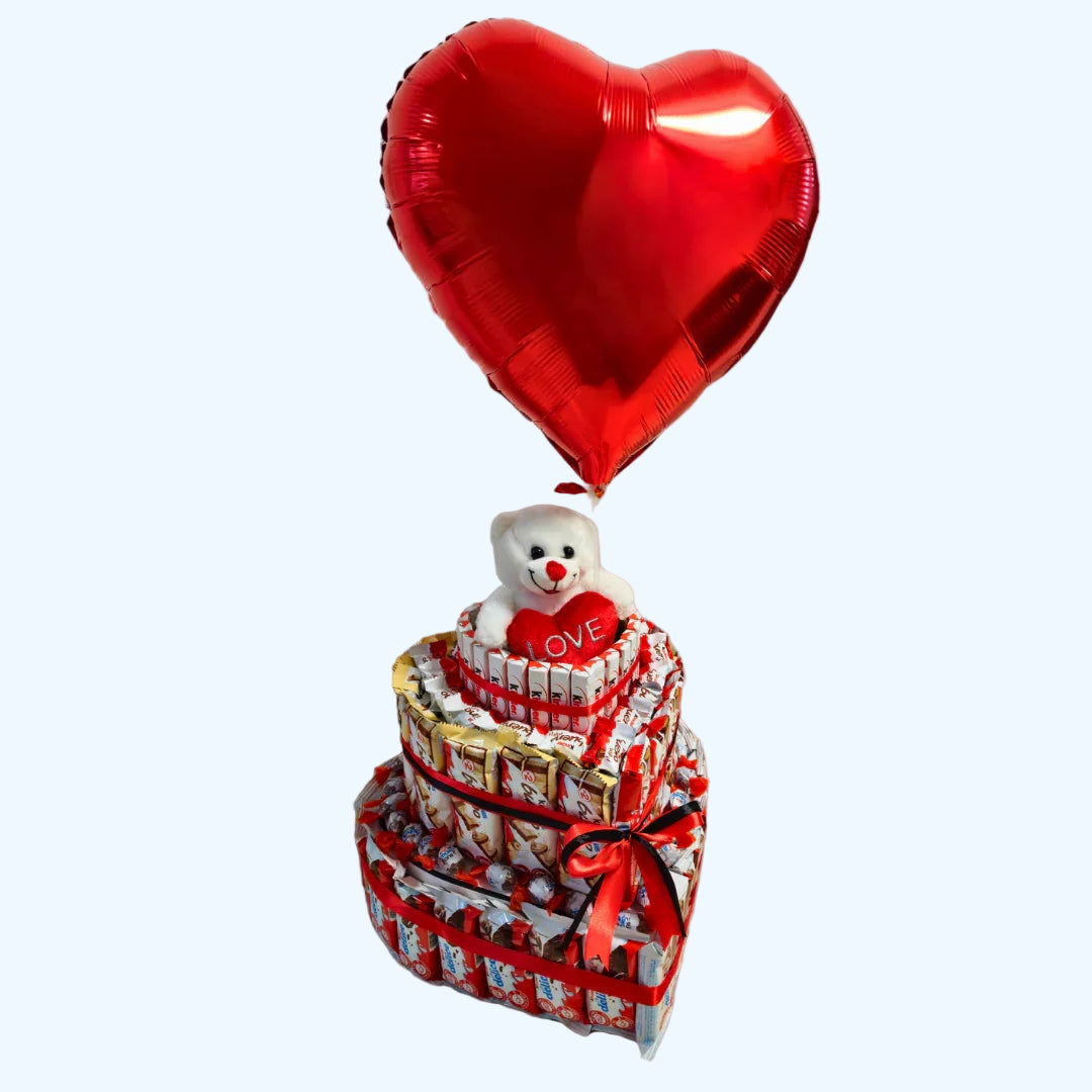 הכירו את עוגת קינדרים "גאיה" – עוגת שוקולד בצורת לב, בשלוש קומות מפוארות של שוקולדי קינדר אהובים, עם דובי מתוק בגובה 20 ס"מ ובלון לב אדום מרשים בגודל 43 ס"מ. מארז קינדר רומנטי מושלם שיגרום לכל לב להתמוסס.